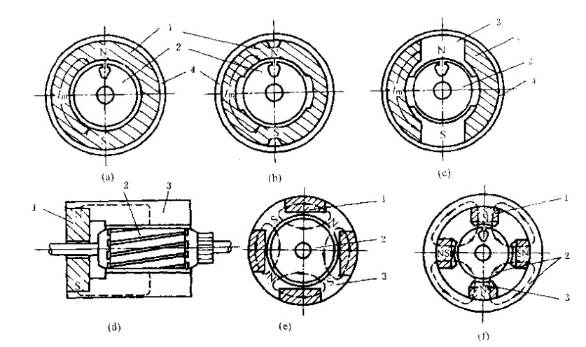 图中结构是采用铝镍钻系列永磁材料的永磁体的几种结构型式。由于铝镍钻系列材料H,值较小,然而永磁体长细比都较大,除了圆简形之外,其他几种结构型式中,软铁极靴结构较为复杂.由于H,值较低,为了防止过多的去磁,有时需要在加工或装配过程中采取保磁措施,如加保磁环等。直流永磁电机中采用铁氧体材料的永磁体结构详细请看图片,由图可知、用铁氧体材料制成的永磁体多是薄片形或圆筒形,沿磁化方向的长度I,.较短,这是因为它的Nc较大的缘故。