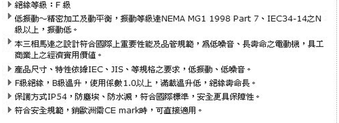 台湾高崎立式高效率电机 產品系列:AEHL/AEUL系列(JIS/CNS系列) 马力(HP): 1/4HP~100HP(0.18KW-75KW)极数( P ):2、4、6 电压( v ):200~460 频率(Hz): 50、60 框号(F#): 63~250 保护方式: IP54 绝缘等级: F 级 ●高效率~提升能源使用效率,比原标准系列损失降低10%~30%,运转越久,节省的电费越多。 ●低振动~精密加工及动平衡,振动等级达NEMA MG1 1998 Part 7、IEC34-14之N级以上,振动低。 ●本三相马达之设计符合国际上重要性能及品管规范,為低噪音、长寿命之电动机,具工、商业上之经济实用价值。 ●產品尺寸、特性依据IEC、JIS、等规格之要求,低振动、低噪音。 ●F级绝缘,B级温升,使用系数1.0以上,满载温升低,绝缘寿命长。 ●保护方式IP54,防尘埃、防水溅,符合国际标準,安全更具保障性。 ●符合安全规范,销欧洲需CE mark时,可直接适用。 ●高效率马达群组系列化,产品齐全符合各国际法规,具跨市场之泛用性。