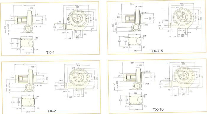 TX透浦式鼓风机的特点高压力.重量轻.风量大.寿命长.噪音低.无油无污染.并且用途相当广泛.适合用于机器送风冷却用.干燥机械.木工机械.厨房机械.马达类送风冷却之类等.......