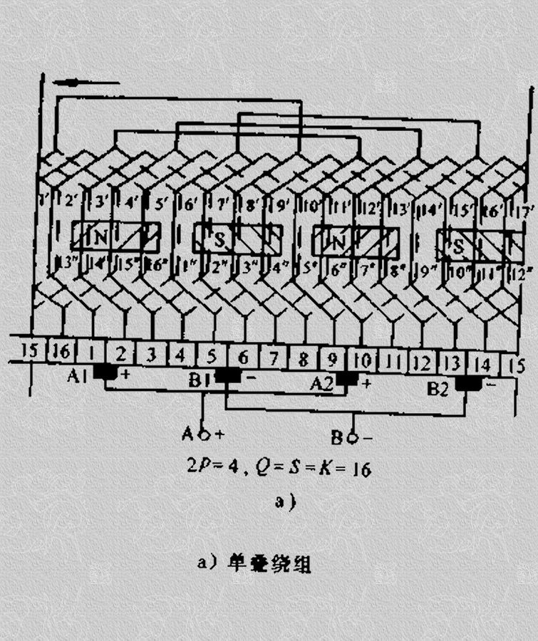 4极电机的复波绕组,其有16个线圈元件。它的实质相当于两个或两个以上的单波绕组交叠在一起,并靠电刷并联起来工作。它和复叠绕组一样也有单闭路和双闭路两种。